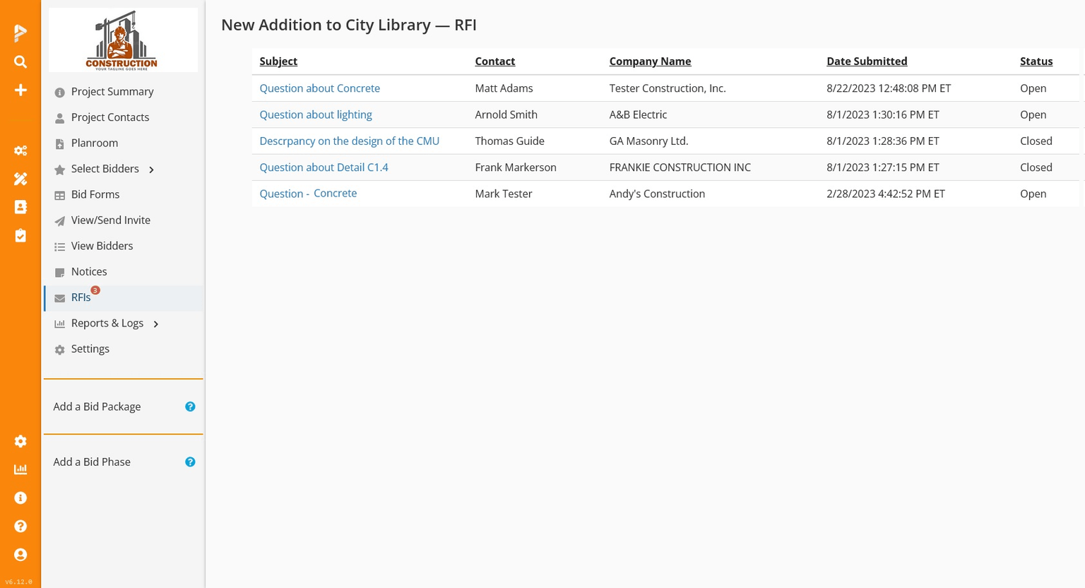 Subcontractors can submit RFIs directly into your private planroom portal. Your bidding team has visibility into all questions which can be answered individually or compiled into an FRI Log sent to some or all subcontractors and vendors.